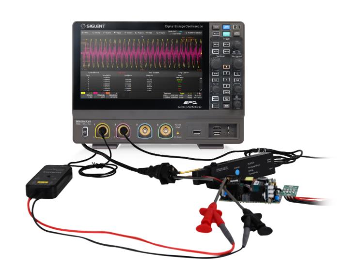 電源分析功能能夠幫助用戶快捷測量和分析電力電子領域中的多個項目,如電源質量, 諧波, 浪涌電流, 開關損耗, 輸出紋波, 瞬變響應等,選擇電源分析功能后,可根據連接指南正確連接電壓和電流探頭,此外,和波特圖軟件相配合還可以對電源環路響應進行測量分析,在一定情況下可取代昂貴的網絡分析儀,可廣泛應用在開關功率器件參數測量、電源控制回路調制特征分析和線路功率諧波分析等領域。