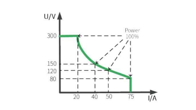 N38300系列直流電源輸出采用寬范圍設計,單臺電源可以在額定輸出功率下,輸出更寬范圍的電壓和電流,滿足工程師對多種電壓/電流等級產品測試應用場景,大幅降低實驗室或自動化測試系統中電源成本及占用空間。以其中一個型號N38306-300-75為例,電源輸出功率為6000W,最大輸出電壓和輸出電流分別達到了300V和75A,使得N38300適用范圍比傳統電源更廣泛。