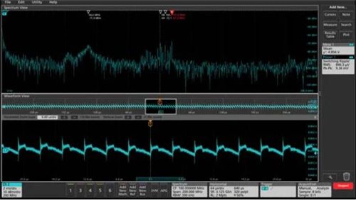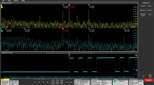 使用“頻譜視圖”選項,4 系列 MSO 上的每個模擬通道都可以向您顯示時域波形、頻譜或兩者。時間和頻率圖同步,幫助您快速確定哪些信號被干擾,哪些信號是干擾源。
