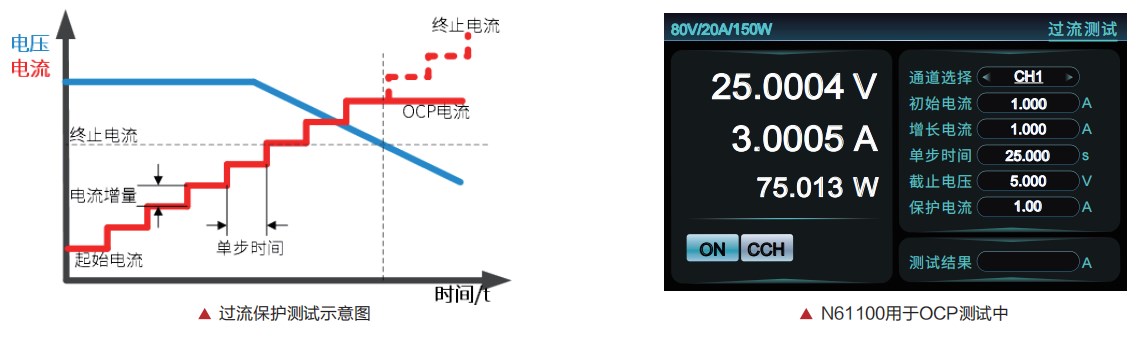 OCP測(cè)試時(shí),負(fù)載以恒電流模式進(jìn)行拉載,同時(shí)檢查被測(cè)物電壓是否低于終止電壓。如被測(cè)物電壓低于截止電壓,則記錄此時(shí)的拉載電流作為測(cè)試結(jié)果,并關(guān)閉輸入,停止測(cè)試;如被測(cè)物電壓高于截止電壓,負(fù)載增加拉載電流,直到電壓低于截止電壓或達(dá)到最大拉載電流。