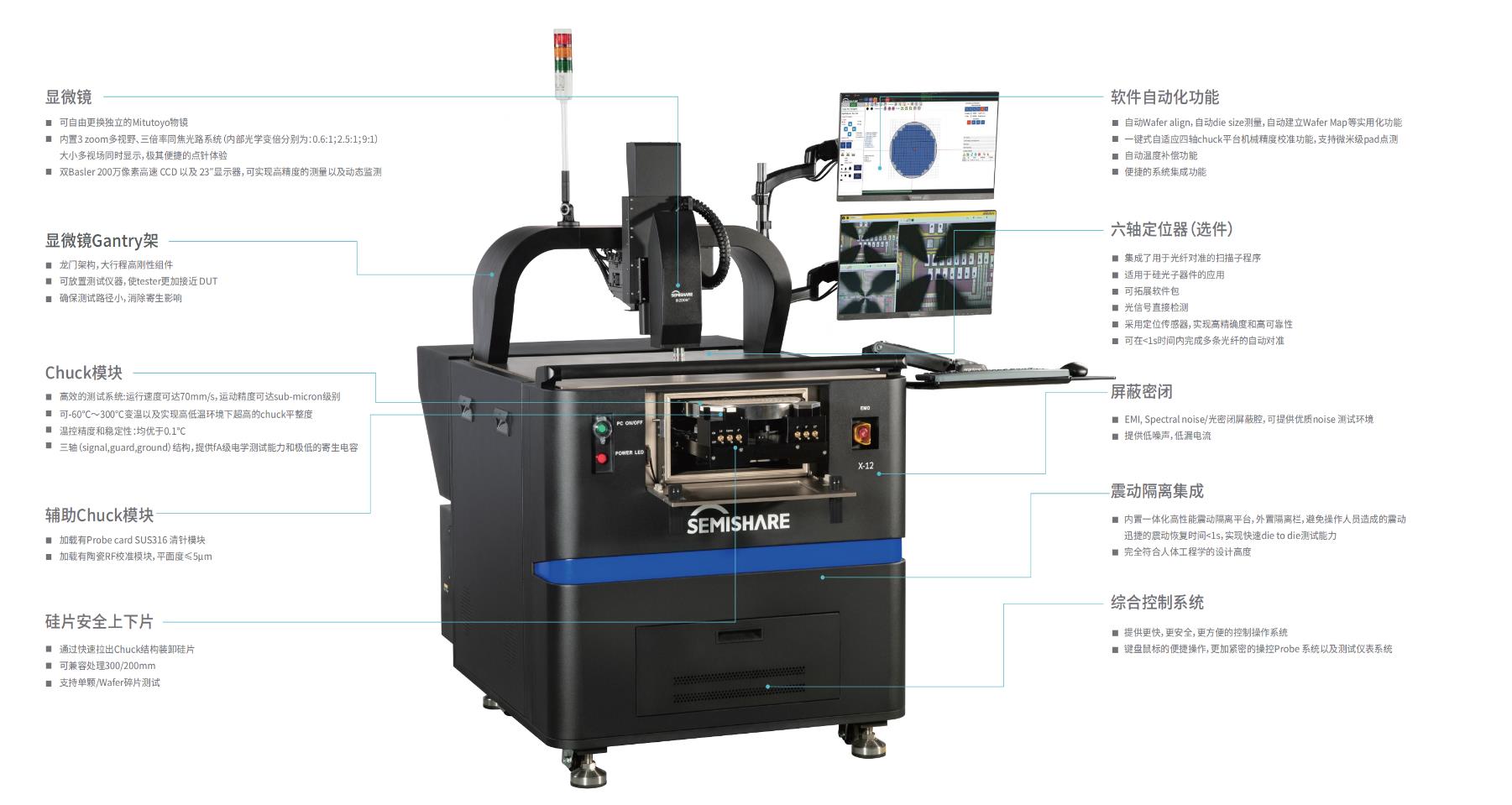 ● 高效的CHUCK測試系統運行速度≥70mm/s,運動精度≤1μm,同時移動轉位時間index time≤500ms,優異的系統運行參數已達到領先水平,高測試精度和效率滿足各類晶圓和器件的高重復性與穩定性測試測試效率有效提升40%以上;