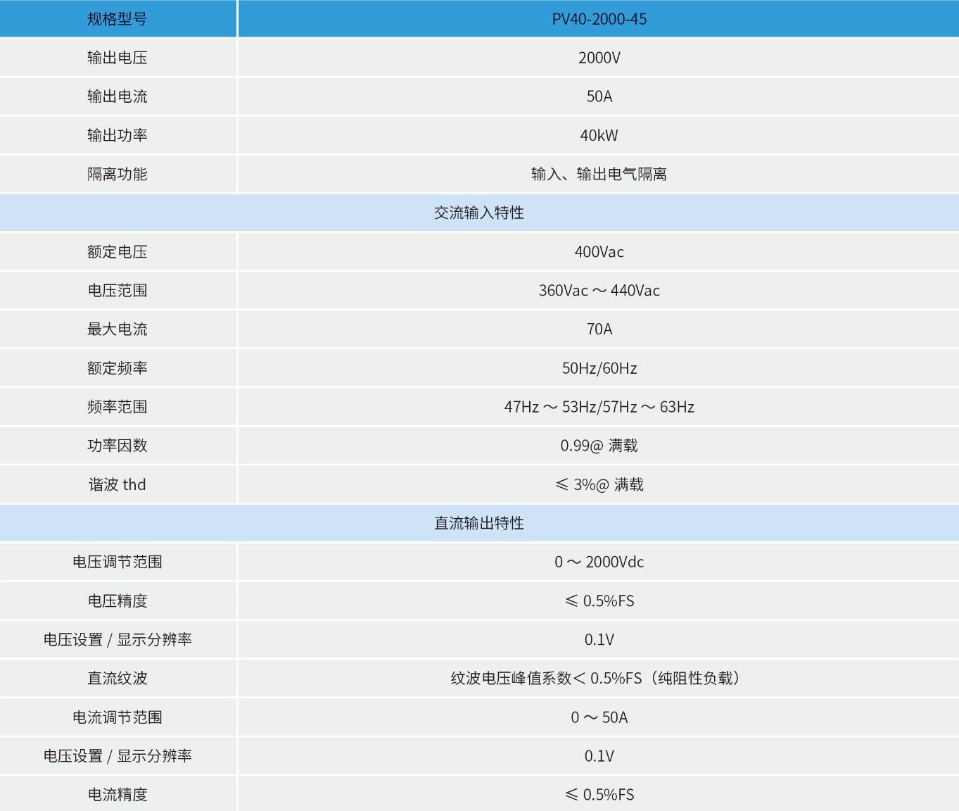 PV40-2000-45單向直流源 產品特點: ?采用高頻隔離方案,高功率密度 ?支持恒壓、恒流自動切換 ?支持多機并聯使用,易于功率擴展 ?具備光伏I-V曲線模擬功能 ?電網適應性強,支持