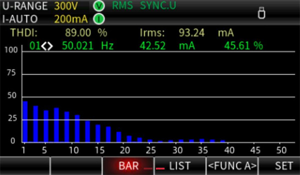 諧波測量有柱形圖(BAR)和列表(LIST)值兩種顯示模式 完全符合諧波測量國際標準IEC61000-4-7:2002, 根據基波頻率,電壓、電流、功率分別可測量到最多50次諧波, 總諧波失真(THD),還是基波成分、各次數的諧波含量、相位差、諧波失真因數等均可測量。 諧波分析次數的上限值可在1~50次之間自由設置,對THD運算上限次數有規定的場合也可按照其規格進行運算。