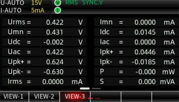 三種顯示風格; VIEW-1:Meter常規測量界面 VIEW-2:同時顯示14個參數 VIEW-3:數學運算界面