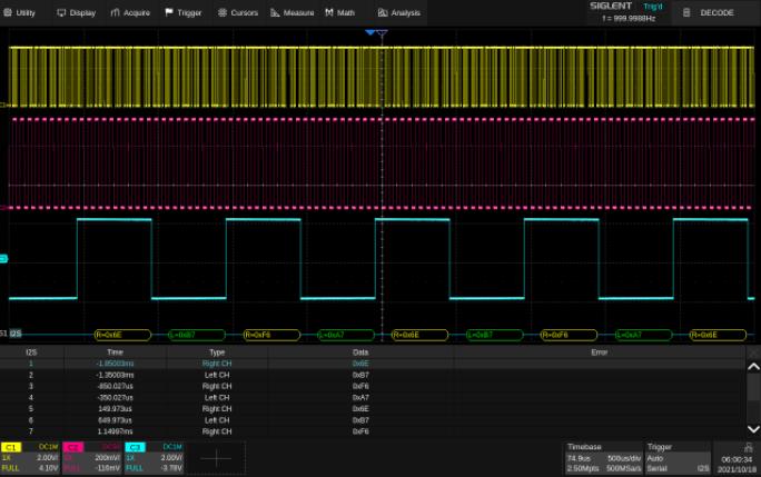 SDS2000X HD標配了I2C、SPI、 UART、 CAN、 LIN五種串行協議觸發及解碼,并可選配CAN FD、 FlexRay、 I2S、MIL-STD-1553B、SENT和Manchester等多種協議。通過事件列表顯示,能快速、直觀地將總線的協議信息以表格形式顯示,并能同時顯示2個總線解碼結果。