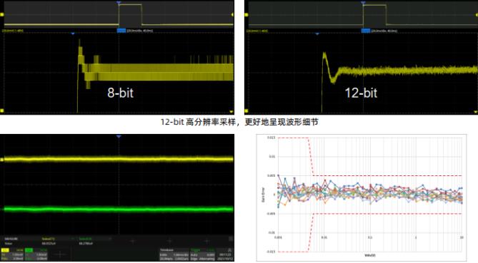 · 12-bit高分辨率ADC采樣,更好地呈現波形細節。相比于普通的8-bit示波器256級量化等級,12-bit示波器可達到4096級,是普通示波器的16倍,具備更小的量化誤差。