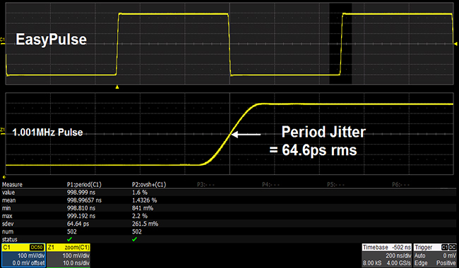 DDS方法輸出方波/脈沖時, 如果采樣率和輸出頻率不成整數倍關系,將產生一個采樣周期的抖動。采用EasyPulse技術可克服這個缺陷;產生低抖動的方波和脈沖信號,此外還具有以下優勢: