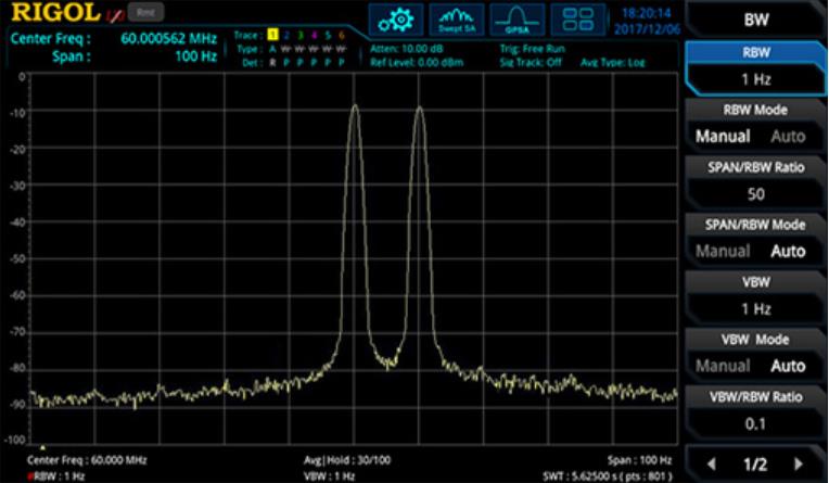 分辨頻率相近的信號對于驗證許多RF器件和系統至關重要。使用RSA3000,掃描頻寬僅為1 Hz的RBW分辨率帶寬,可以查看相鄰信號的更多細節。