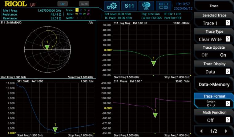 VNA模式可以實現對元器件、電路網絡的S11、S21以及故障點定 位的測量,通過史密斯圓圖、極坐標等多種顯示更精確地表征被測 件的網絡特性