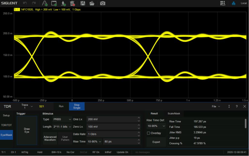 SNA5000X搭載了眼圖功能,眼圖可以反映信號鏈路上傳輸的數字信號的整體特征,從中觀察出碼間串擾和噪聲的影響,進而估計系統的優劣程度。眼圖分析是高速系統信號完整性分析的核心,為需要對高速信號進行時域分析的客戶節省了大量成本和時間。