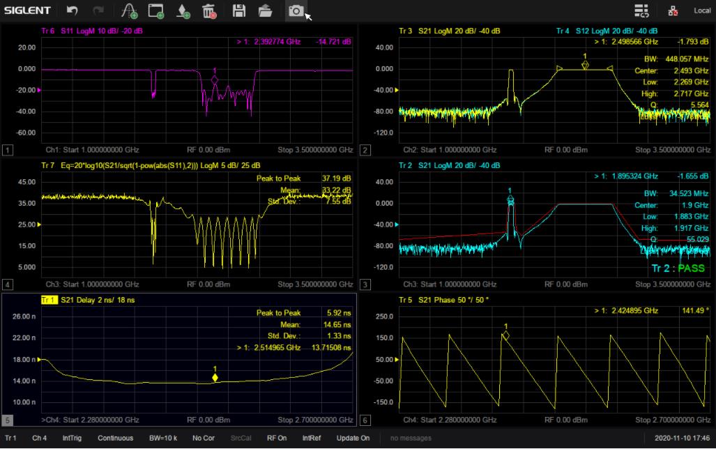 SNA5000X系列支持在多個窗口添加多條跡線進行全4端口S參數測試,并且具備多種顯示格式,比如 Log Mag,Lin Mag,Phase,Delay,Smith,SWR,Polar等,可以方便快捷地分析被測物的傳輸系數,反射系數,駐波比,阻抗匹配,相位,延時等參數。在生產線驗證天線,濾波器等的特性時,還可以保存參考跡線或者添加Limit模板進行通過失敗測試,有利于提高生產效率。