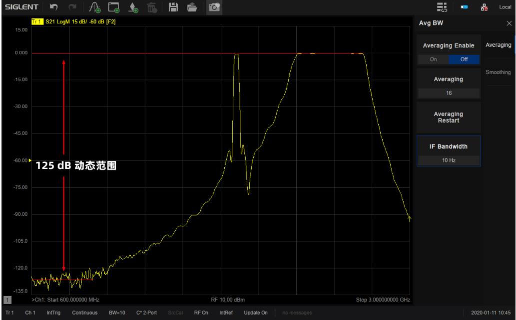系統動態范圍是VNA一個非常重要的指標,它是VNA源的最大輸出功率與測試端口本底噪聲的差值。SNA5000X的動態范圍可達125 dB@10Hz IFBW,接收機噪底-125 dBm/Hz,可適用于對動態范圍要求比較高的測試場景,比如同時測量濾波器的通帶和帶外抑制性能。