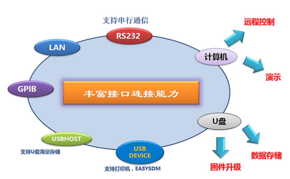 SDM3055X-E 5?位高精度臺式萬用表,配置接口:USB Device,USB Host,LAN,GPIB(選配) 設置和測量數據可通過 VXI-11,USBTMC, U 盤導入或 者導出以方便用戶修改