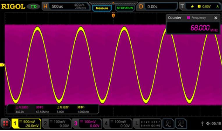 同時觀察并準(zhǔn)確測量兩路頻率相差很大的信號,全內(nèi)存硬件測量可以在具有340k個上升沿的波形中測得準(zhǔn)確的頻率值。