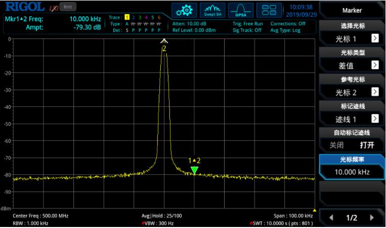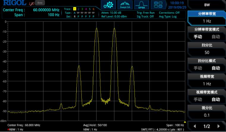 分辨頻率相近的信號對于驗證許多RF器件和系統(tǒng)至關(guān)重要。使用RSA3000E僅為1 Hz的RBW分辨率帶寬,可以查看相鄰信號的更多細(xì)節(jié)。