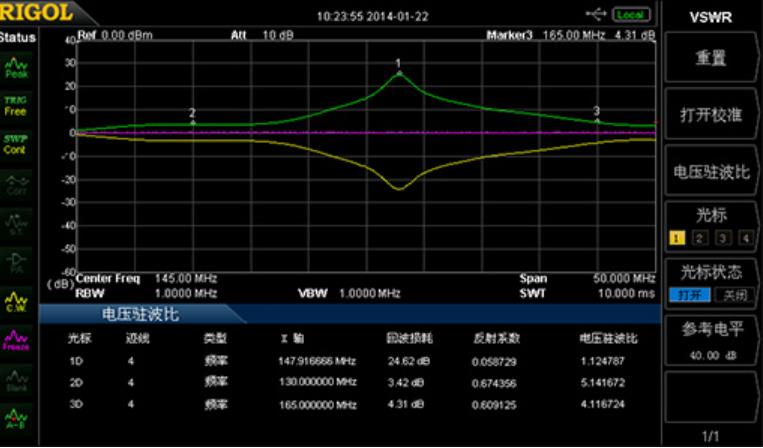 DSA800系列具備VSWR測量能力,選擇帶有跟蹤源型號(-TG),配合VSWR電橋實現電壓駐波比測試。