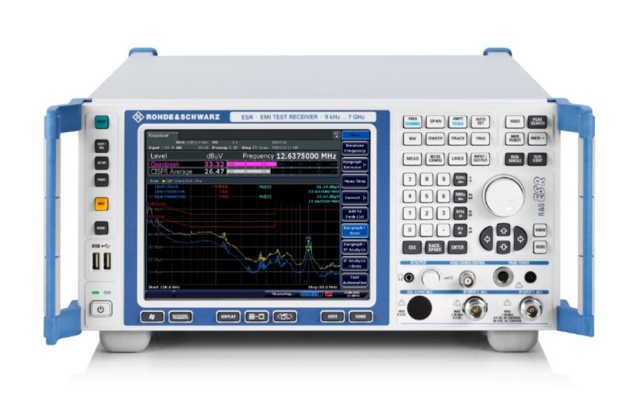 ESR EMI 測試接收機專用于通過傳統的步進式掃描或基于 FFT 的超快時域掃描來測量電磁干擾。接收機還可以用作功能強大的信號與頻譜分析儀。接收機具備實時頻譜分析功能和廣泛的診斷工具,能夠詳細分析干擾信號及其歷史記錄。用戶可以使用這些工具檢測隱藏或偶發輻射并分析成因。R&S®ESR 的易用觸摸屏中配有簡單直觀的菜單。R&S®ESR 具有緊湊尺寸、輕量設計、可選加固外殼和可選直流電源,同樣適用于移動應用。