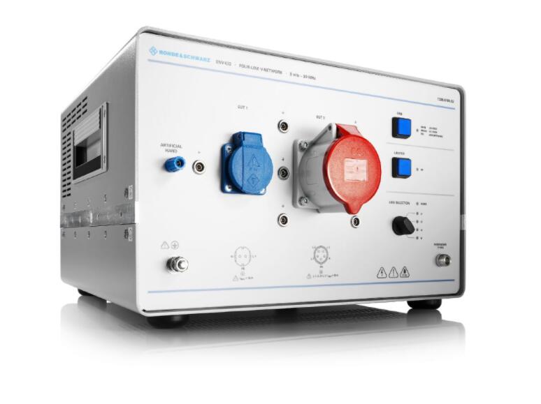 R&S®ENV432 四線制 V 形網絡滿足 CISPR 16?1?2、EN 55016-1-2 和 ANSI C63.4 中有關 V 形網絡的要求,在 9 kHz 至 30 MHz 的頻率范圍內模擬阻抗為 (50 μH + 5 Ω) || 50 Ω。R&S®ENV432 隨附用于連接被測設備 (EUT) 的 Schuko 插座 (EUT 1) 和 CEE 32 A 插座 (EUT 2)。V 形網絡的相位可以使用前面板開關手動選擇,也可以通過 TTL 控制輸入(兼容最新的羅德與施瓦茨測量接收機)自動選擇。
