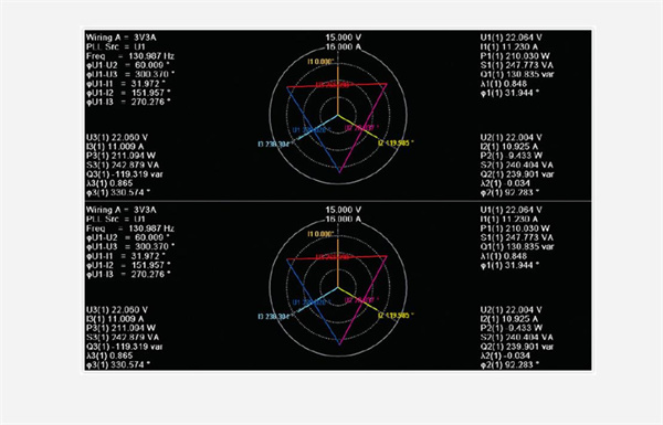 PA6000H功率分析儀可同時測量并顯示變頻器輸入三相與輸出三相的矢量圖,可對輸入、輸出各相間的相角關系進行分析,準確評估出輸入信號對輸出信號的角差影響。