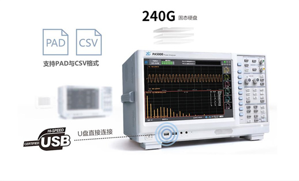 PA5000H功率分析儀擁有高達240G的固態硬盤可以海量存儲數據,用戶更可以直接連接U盤將想要的數據全部儲存,PAD與CSV格式多樣支持、存儲時間隨意控制,讓存儲再也不是難題。