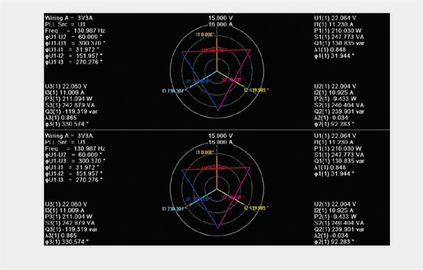 PA5000H功率分析儀可同時測量并顯示變頻器輸入三相與輸出三相的矢量圖,可對輸入、輸出各相間的相角關系進行分析,準確評估出輸入信號對輸出信號的角差影響。(所有型號均能滿足)