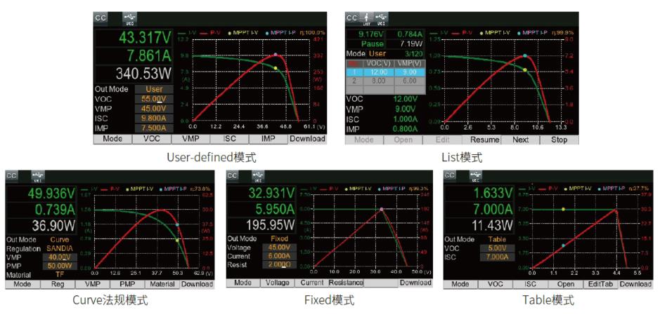 IT-N2100系列電源自帶5種PV模型,客戶可通過前面板操作,通過內建各國法規IV曲線模型、四點法、table描點法、fixed模式或list編程,模擬太陽能陣列IV曲線的輸出,大屏圖形化顯示,實時查看微逆變器、功率優化器等待測物的MPPT跟蹤狀態。此外,模型亦可通過儀器面板U盤導入文件。當需要多臺同步操作時,使用上位機軟件太陽能矩陣模擬軟件實現同步操作更方便。