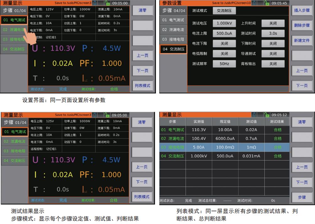 儀器配有7寸觸摸屏,可直接對儀器進行觸摸式控制操 作,所有測試模式、時間、電壓、電流、電阻值、測試步驟在同一屏幕上顯示。另有列表顯示模式,顯示多步驟的設置及順序測試結果。