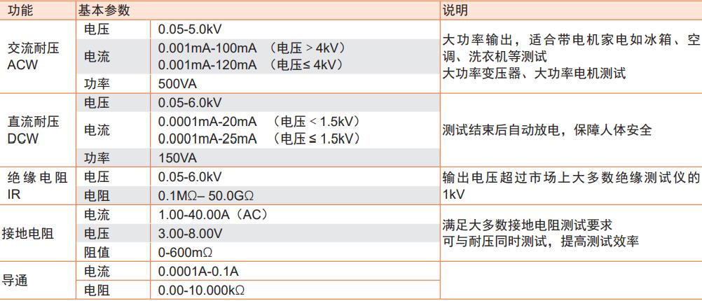 耐壓測試:輸出功率AC:500VA/200VA ( 5kV/100mA,5kV/40mA),DC:120VA 6kV/20mA),因此可用來為大功率的電器、電機等方面設備做耐壓測試,也可以對零件做同樣的測試。